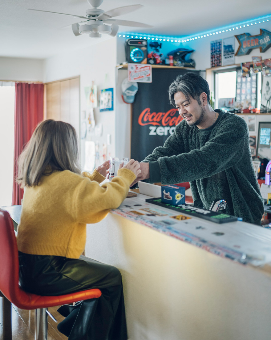 - はい。みんなでお酒を飲んで楽しむために、キッチン前のカウンターも友だちと一緒に自作しました。このカウンターは、ホームセンターで木の板を買ってきて作ったんです。いかにお金をかけずにカスタマイズするかを考えています。